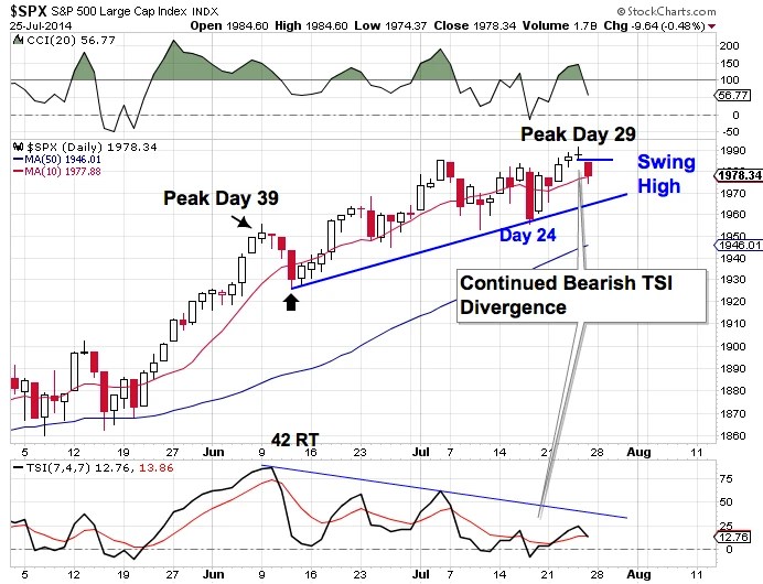 A swing high formed on Friday. Stocks will enter the timing band to pring a daily cycle low next week. A break of the daily cycle trend line is required to confirm the daily cycle decline. However, Friday’s Buying on Weakness print suggests there will be one more push higher.
