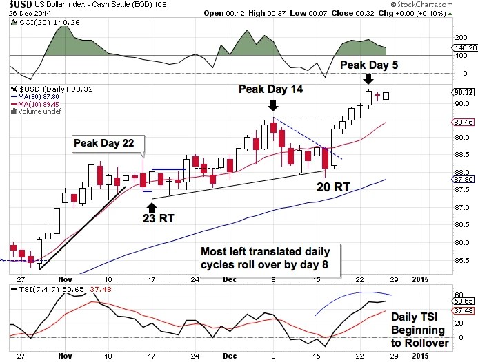 If the current daily cycle is to form in a left translated manner, then we should see a peak in the coming week. Any new highs past Monday will begin to shift the likelihood of the current daily cycle forming as a right translated cycle. If this cycle forms as a right translated cycle then we would expect to see one more daily cycle that forms as a left translated, failed daily cycle which would then lead to the intermediate cycle decline.