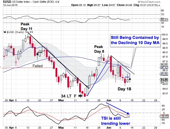 The dollar’s daily cycle peaked on day 8. It managed to close above the upper cycle band for the next 3 days. The dollar then broke below the upper cycle band on day 12 in a clear and convincing manner to confirm the daily cycle decline.