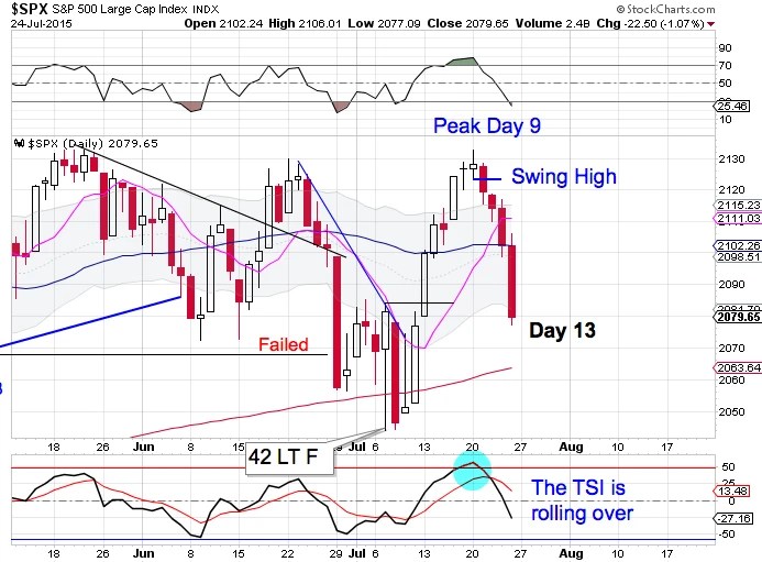 The Russell emerged from its intermediate cycle low but but was rejected by the upper daily cycle band. The Russell went on to lose the 50 day MA and closed below the July 7th low forming a failed daily cycle.