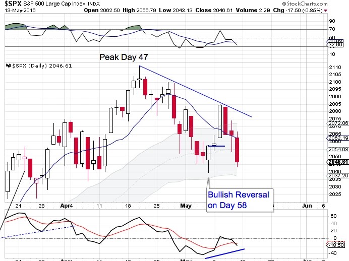 There has been no break of the declining trend line to confirm a new daily cycle. So if stocks break below the day 58 low, that would extend the daily cycle decline. However stocks are still in a daily uptrend. They will remain in the daily uptrend until they close below the lower daily cycle band.