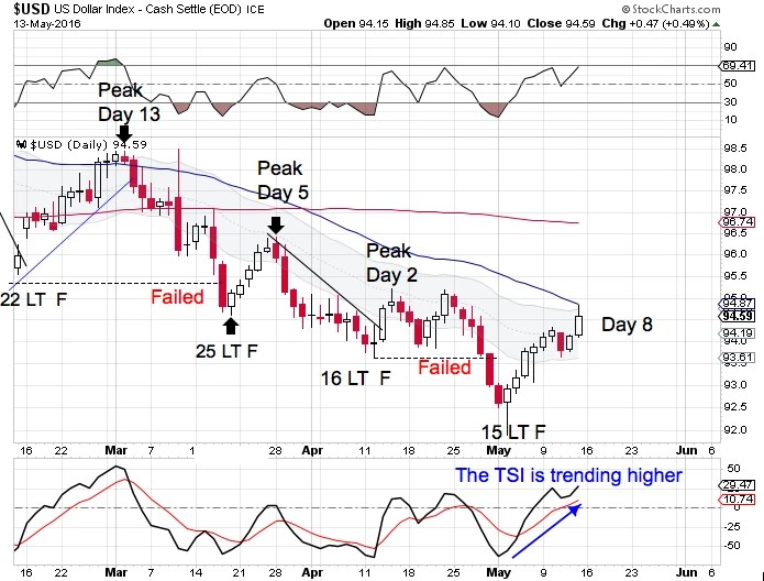 The dollar printed its lowest point in day 15. The swing low and close above the lower daily cycle band signaled that day 15 was an early daily cycle low. The dollar continued to rally, printing a higher on Friday day 8. If the dollar can close above the upper daily cycle band that will signal a new daily uptrend and indicate that the intermediate cycle low has been set.
