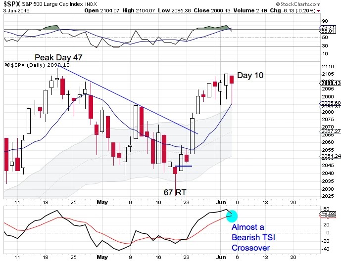 Friday was day 10 for the new daily cycle. Stocks appear to be trading sideways, allowing the 10 day MA to catch up.