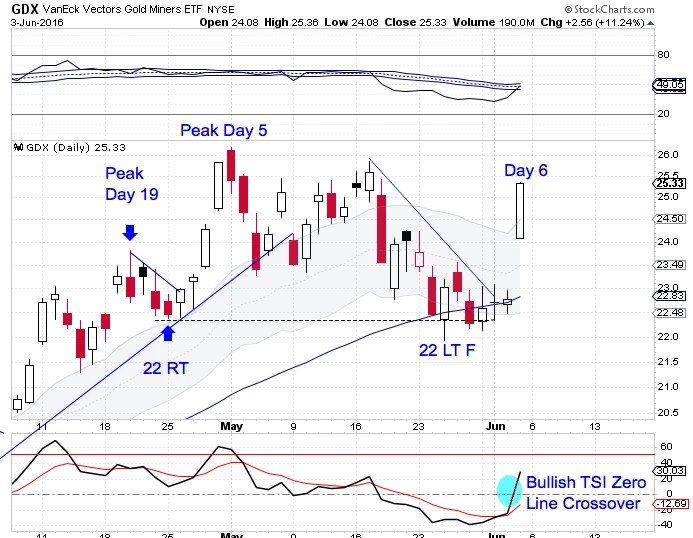 The Miners reacted bullishly to the dollar’s plunge. They broke above the declining daily cycle trend line in a clear and convincing manner to confirm that Friday was day 6 of the new daily cycle.