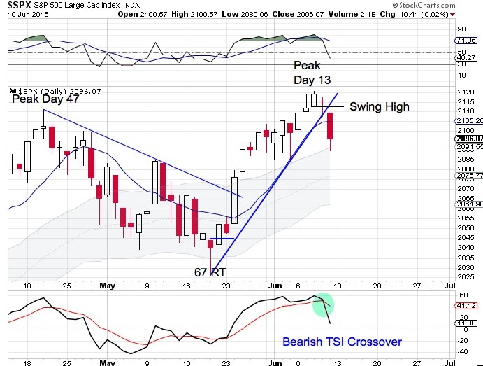 The daily equity cycle peaked on Wednesday day 13. The daily swing high and break of the daily cycle trend line could signal a move into a half cycle low. But the intermediate set-up suggest something more sinister is afoot, which we discuss in the Weekend Report.