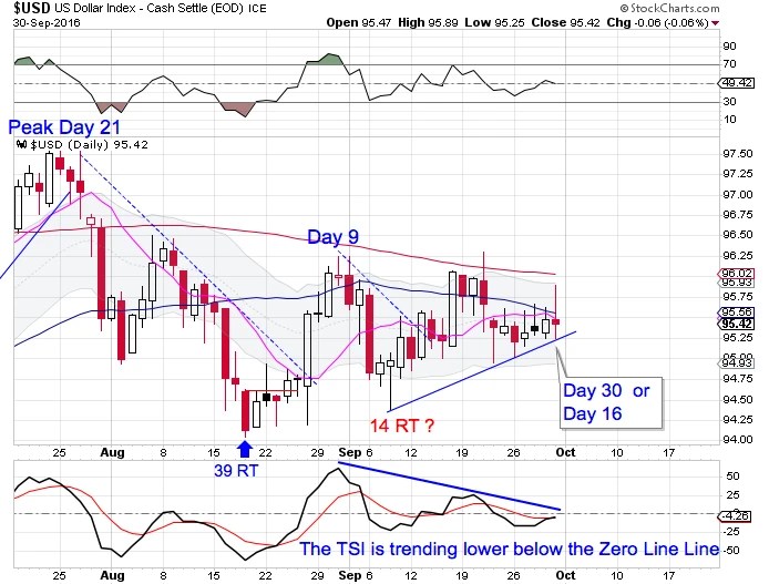 The recent volatility has obscured our daily cycle count. Since the dollar has not been able to regain the 50 day MA I believe that Friday was day 30 for the dollar’s daily cycle. Which places the dollar late in its daily cycle timing band.