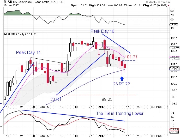 After peaking on day 16, the dollar formed a swing high & closed below the upper daily cycle band to signal the daily cycle decline.