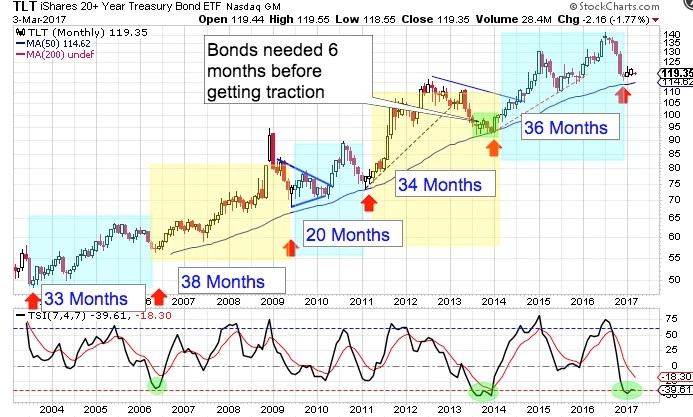 As previously stated, bonds formed a monthly swing low to signal a new yearly cycle. Approximately every 32 – 36 months bonds form a 3 year low. The current monthly swing low is in the timing band for a 3 year cycle low. So confirmation of the new yearly cycle will also signal that bonds are in a new 3 year cycle. So far bonds have not gained much traction as it tries to rally out of the 3 year low. This is beginning to appear similar to the 2014 three year low where bonds consolidated for 6 months before getting traction.