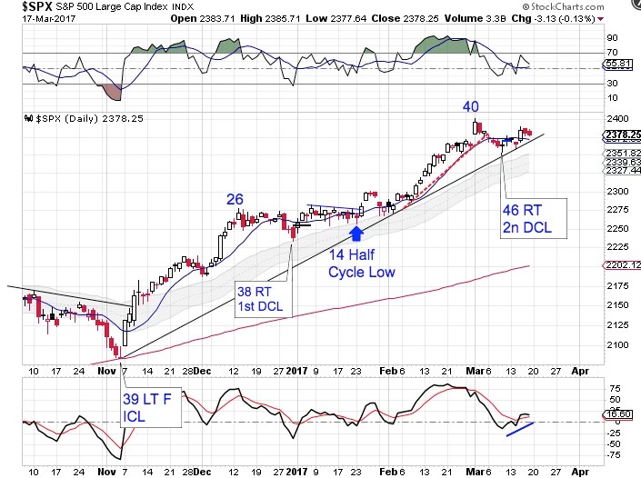 The peak on day 19 indicates a right translated daily cycle formation and the the February DCL also hosted an intermediate cycle low. But by closing below the lower daily cycle band, that ends the daily uptrend and is a signal that the next daily cycle may form as a left translated cycle.