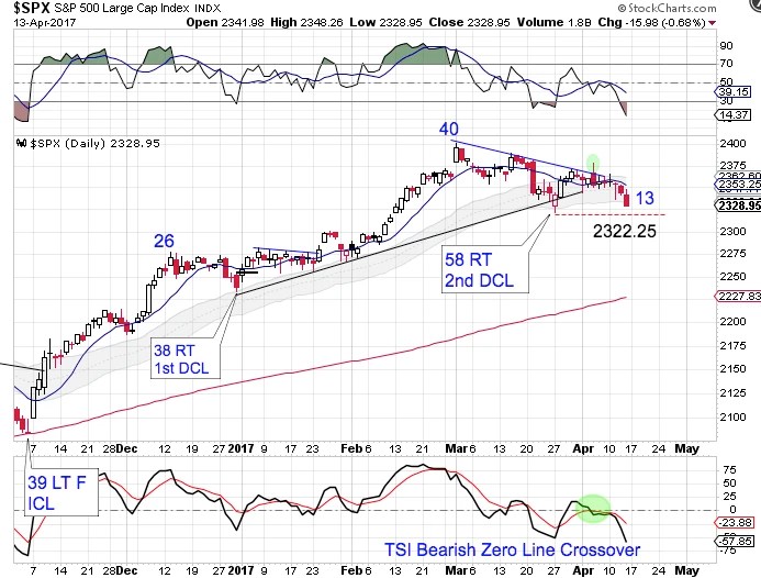 Closing below the lower daily cycle band signals an end to the daily uptrend. It is also a reliable indicator that the intermediate cycle is in decline. The peak on day 7 locks in a left translated daily cycle formation. A break below 2322.25 would form a failed daily cycle and confirm the intermediate cycle is in decline. And something to keep in mind is that the previous daily cycle was stretched at 58 days. Since cycles tend to balance a stretched cycle with a shortened cycle, we could see a shortened daily cycle here with stocks possibly printing a DCL next week.
