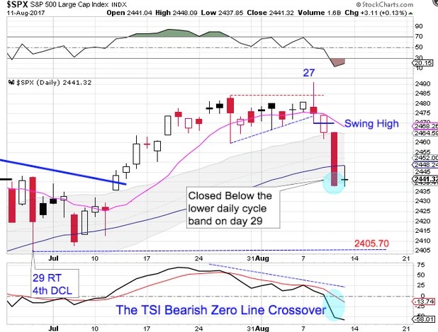 Friday was day 30 for the daily equity cycle, placing stocks in their timing band for a daily cycle low. A swing low is required to mark the daily cycle low. Stocks did not break lower on Friday as they formed the narrow range day. Stocks need to do one of 2 things to form a swing low. First they could print another narrow range day that is a lower than Thursday’s low of 2437.75. That would ease the parameters for forming a daily swing low. Otherwise stocks will need to break above Thursday’s high of 2465.38 in order to form a swing low.