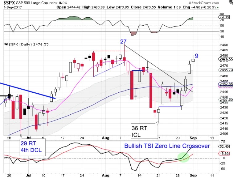 Stocks closed above the declining trend line on Wednesday to confirm the new daily cycle.