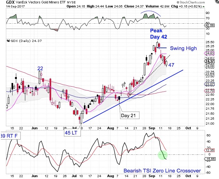 Thursday was day 47 for the daily Miner cycle. That places the Miners deep in their timing band to form a daily cycle low. Thursday’s bullish print eases the parameters for forming a swing low. With the Miners in a daily uptrend it is very tempting to buy the swing low.