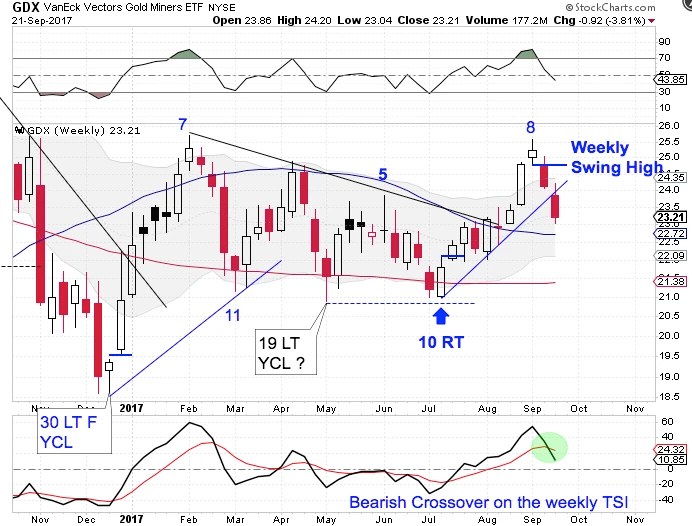 Week 31 remains as the lowest point, placing the dollar late in its timing band to form an ICL. The dollar has confirmed that it began a new daily cycle. So a weekly swing low and a break above the declining 10 week MA will confirm the new intermediate cycle. A break above 92.69 will form a weekly swing low. And if the dollar confirms a new intermediate cycle that should send the Miners to seek out their intermediate cycle low.