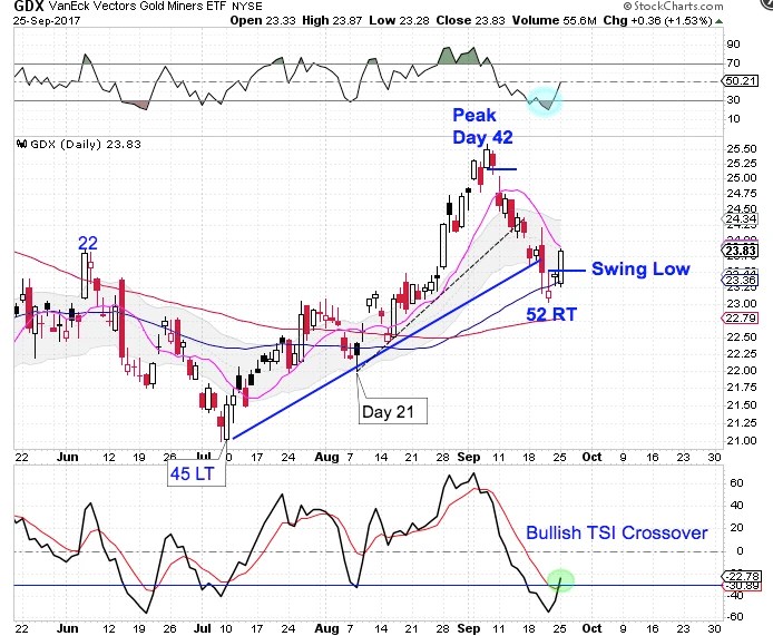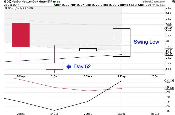 The Miners printed their lowest point on Thursday, which was day 52. The Miners came close to printing a swing low on Friday, but no cigar. The Miners only had 1 daily cycle longer than 52 days over the past 2 years, which occurred in March at 53 days.