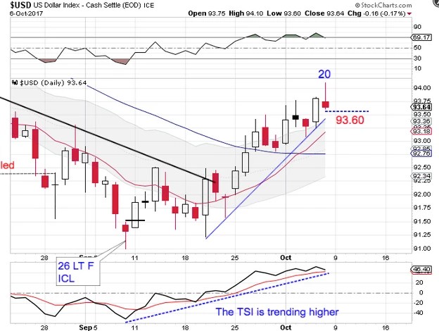 Friday was day 20 for the dollar’s daily cycle, placing the dollar in its timing band for seeking a daily cycle low. A swing high and a break below the daily cycle trend line will confirm the daily cycle decline. A break below 93.60 will form a daily swing high. The dollar continues to close above the upper daily cycle band, indicating a daily uptrend. The dollar will remain in its daily uptrend until it closes below the lower daily cycle band.
