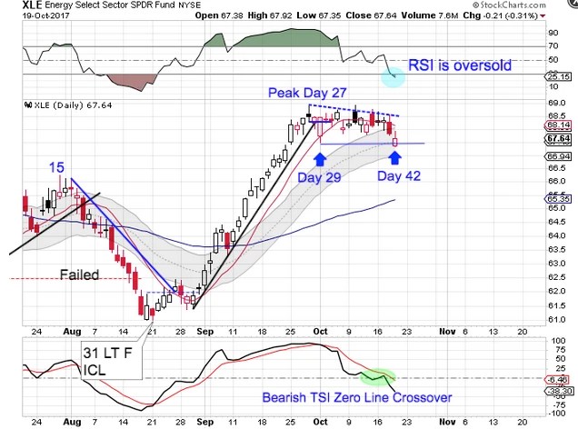 XLE peaked on day 27 and has since been slowly working its way into its daily cycle low. A peak on day 27 assures us of a right translated daily cycle formation. XLE printed its lowest point on Thursday, following the day 27 peak. That places XLE deep in its timing band for a DCL. At this point a swing low and close back above the 10 day MA will confirm a new daily cycle. XLE has begun a new daily uptend. It will continue in its uptrend until it closes below the lower daily cycle band.
