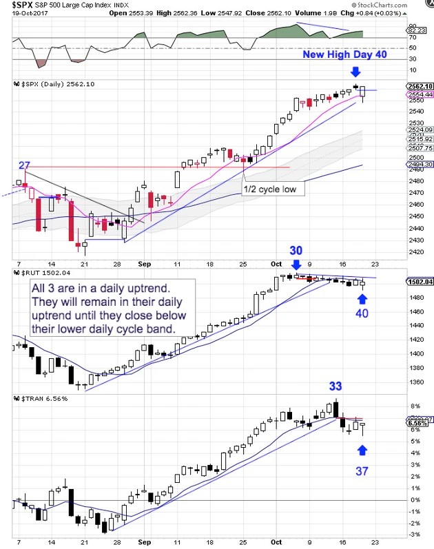 The S&P, the Russell and the Transports are all forming right translated daily cycles. Right translated daily cycles trend higher in a stair step fashion.