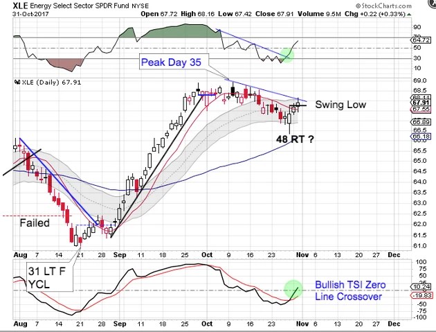 Energy emerged from its yearly cycle low and rallied close to 13% before peaking on day 35. Then it formed a swing high and drifted lower until printing its lowest point on Friday. That was day 48 placing energy very late in its timing band for a daily cycle low.