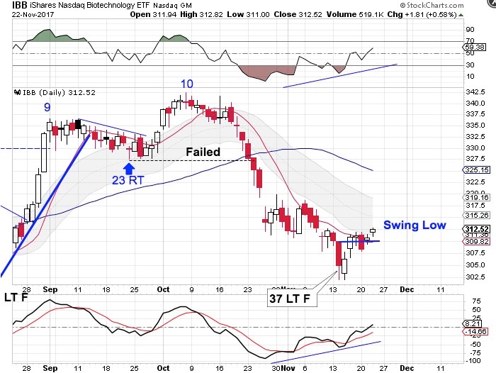 The decline into the day 37 DCL broke below the previous daily cycle low causing biotech to form a failed daily cycle. So the daily swing low also signals a potential beginning of a new intermediate cycle.