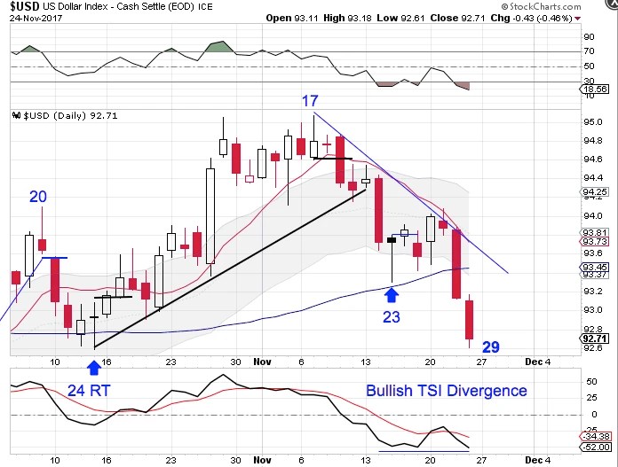 Friday was day 29 for the dollar’s daily cycle. That places the dollar deep in its timing band for a DCL. There are also bullish divergences developing on the oscillators indicating that a bottom is near. A swing low and break of the declining trend line is needed to confirm a new daily cycle. The dollar has begun to close below the lower daily cycle band to indicate a daily downtrend. The dollar will remain in its daily downtrend until it can close above the upper daily cycle band.