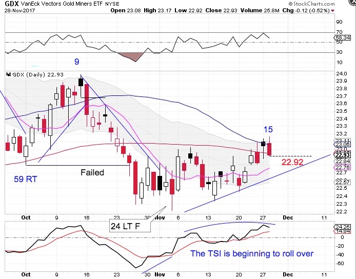 Tuesday was day 15 for the daily Miner cycle, placing the Miners 3 days shy of its timing band for a daily cycle low. The Miners have been trying to close above the 50 day MA for the last 3 trading sessions. On Tuesday the Miners were rejected by the declining 50 day MA and then went on to close below the 200 day MA. With the dollar apparently beginning a new daily cycle it is quite likely that the Miners have begun their daily cycle decline. A break below 22.92 will form a swing high and then a break of the daily cycle trend line will confirm the daily cycle decline.