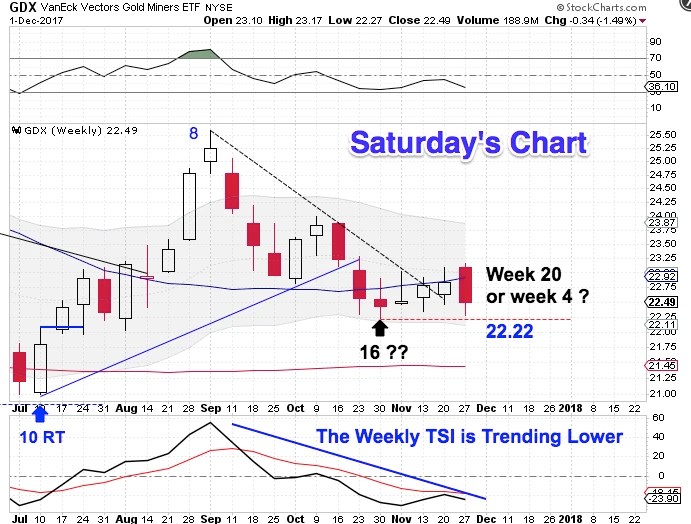 Prior to this week, Week 16 was the lowest point for the Miners following the early September peak. Since 16 weeks was a bit early for an intermediate cycle low we were looking for a close above the rising 50 week MA for confirmation of a new intermediate cycle.