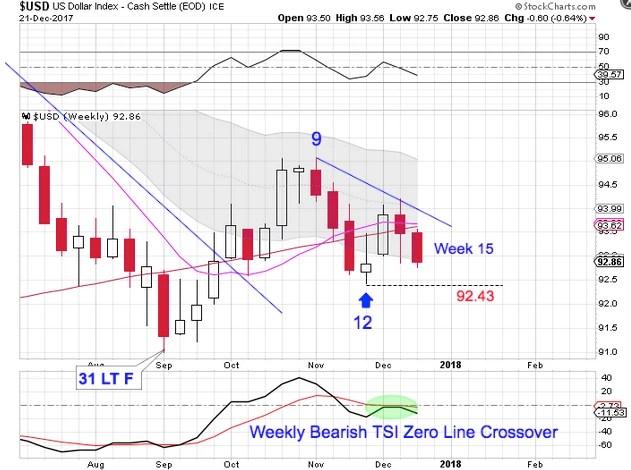 The dollar printed its lowest point following the week 9 peak. A brief counter-trend rally followed where the dollar managed to regain the 200 week MA. However the dollar has now convincingly lost the 200 week MA. This is week 15 placing the dollar 3 weeks shy of its timing band for an intermediate cycle low. The dollar needs to break below the week 12 low of 92.43 in order to complete its intermediate cycle decline. And with the dollar declining into its intermediate cycle low, that should help to propel the Miners higher.