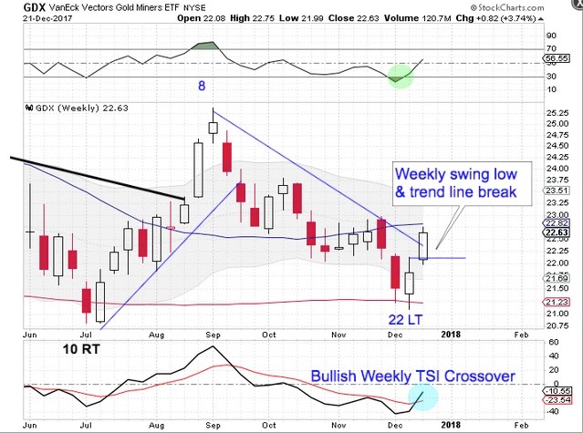The Miners have now broke above the declining weekly trend line. Since week 22 is in the normal timing band for an intermediate cycle low, the declining trend line break provides further confirmation that the Miners are now in week 1 of their new intermediate cycle.