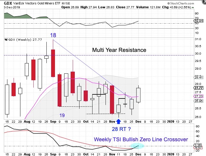 The perfect trade entry for the new intermediate Miner cycle would have been when the Miners formed a weekly swing low during the 3rd week of November. But the Miners did not close above the 10 week MA nor above the declining weekly trend line so in real time we could not be certain that week 28 hosted the ICL.