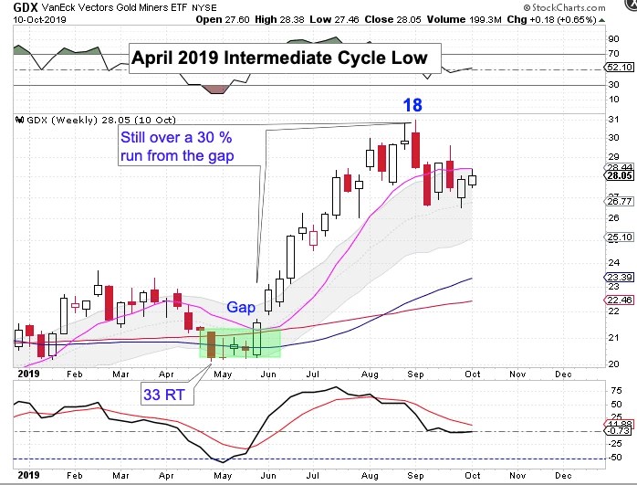 Looking back at the previous intermediate cycle low from April we can see that the Miners coiled for 3 weeks before finally closing above the 10 week Ma on the 4th week. Then the Miners gapped up on the 5th week. Even if someone entered after the gap back in June the Miners still ran rallied for over 30%.