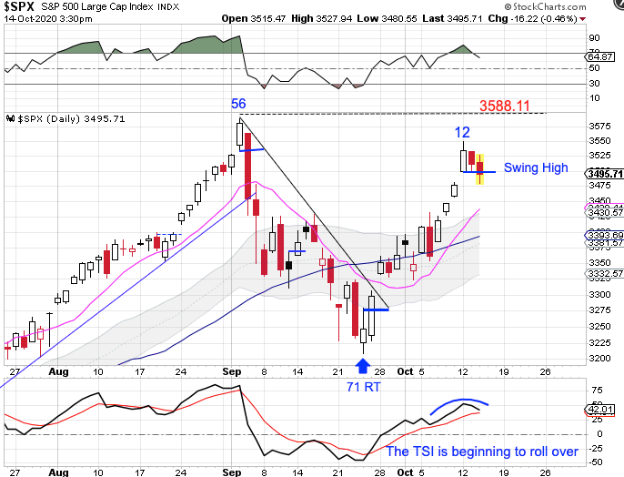 Stocks peaked on Monday, day 12. They closed lower on Tuesday and once again on Wednesday, forming a daily swing high. Stocks did get stretched above the 10 day MA and this may simply be stocks declining into a half cycle low which will allow for the 10 day MA to catch up to price. But there could be another explanation.
