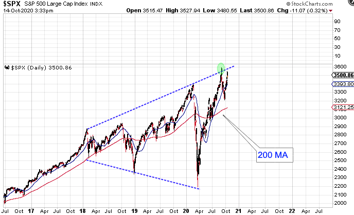 Stocks have been forming this megaphone topping pattern. Resistance from the upper stem could be sending stocks lower. A possible strategy is to exit based on the swing high. If this turns out to be a half cycle decline and then one could reenter on a swing low. This would protect any gains from a deeper sell off. But if stocks deliver a bullish surprise and close above the upper stem, then long positions can be reentered using the upper stem as the stop.