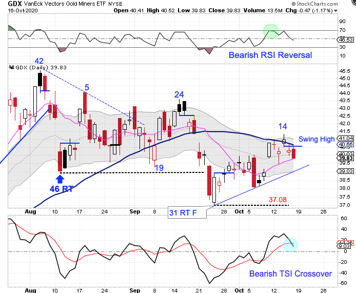 The Miners ran into resistance at the declining 50 day MA on Wednesday.