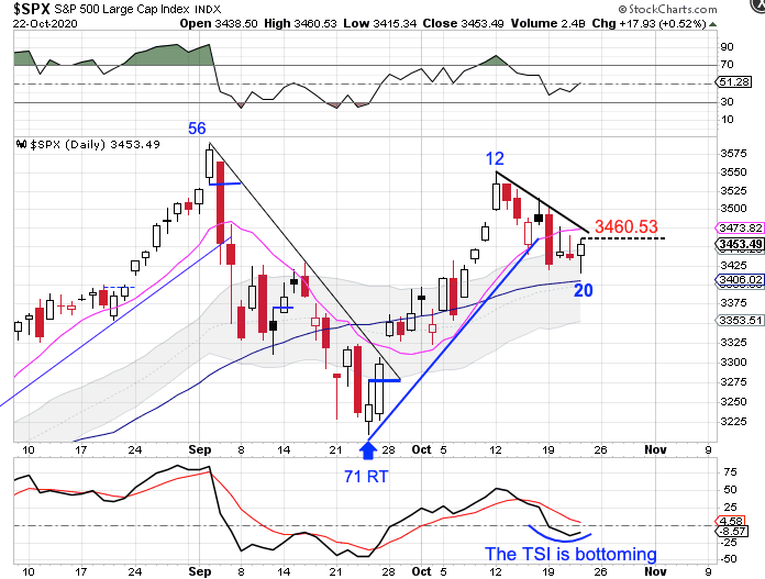 Stocks managed to close above the upper daily cycle band on Thursday to signal a daily uptrend. If stocks form a swing low above the lower daily cycle band then stocks will remain in their daily uptrend and trigger a cycle band buy signal. The bullish reversal eases the parameters for forming a swing low. A break above 3460.53 forms a daily swing low. Then a break above the declining trend line will signal that day 20 was a half cycle low.