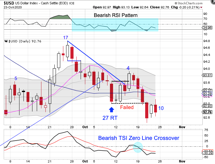 The dollar closed below both the 10 day MA and the 50 day MA on Tuesday. It also broke below below the previous daily cycle low on Tuesday to form failed daily cycle. A failed daily cycle signals the intermediate cycle decline.