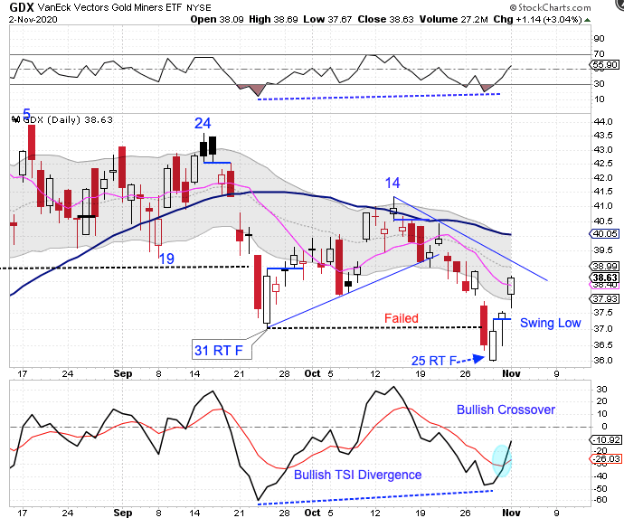 The Miners broke below the previous daily cycle low last Wednesday to form a failed daily cycle. They went on to print their lowest point on Thursday, day 25, placing the Miners in their timing band for a daily cycle low. The Miners formed a swing low on Friday, recovering the breakdown level, then delivered bullish follow through on Monday by closing above the 10 day MA to signal a new daily cycle. The Miners should break above the declining trend line as they rally out of their DCL. And a close above the 50 day MA and upper daily cycle band will end the daily downtrend and begin a new daily uptrend.