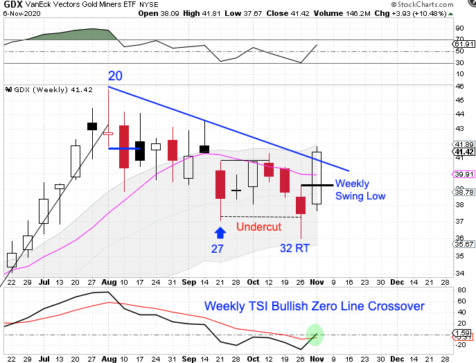 The Miners undercut week 27 to print its lowest point on week 32. That placed the them very deep in their timing band for an intermediate cycle low. The Miners formed a weekly swing low and closed convincingly above the 10 week MA and the declining weekly trend line to confirm the new intermediate cycle. The Miners are currently in a weekly uptrend. Forming the weekly swing low above the lower weekly cycle band indicates a continuation of their weekly uptrend and triggers a weekly cycle band buy signal.