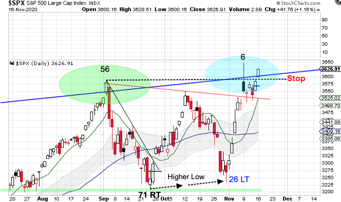 However, stocks printed a bullish reversal on Tuesday at the neckline support. Stocks backtested the neckline support on Thursday then formed a swing low on Friday. Stocks closed above the upper megaphone trend line on Monday. Long positions can be entered here using the September high as the stop. And a close above the day 6 high of 3645.99 would mean that a bubble scenario is back on the table.