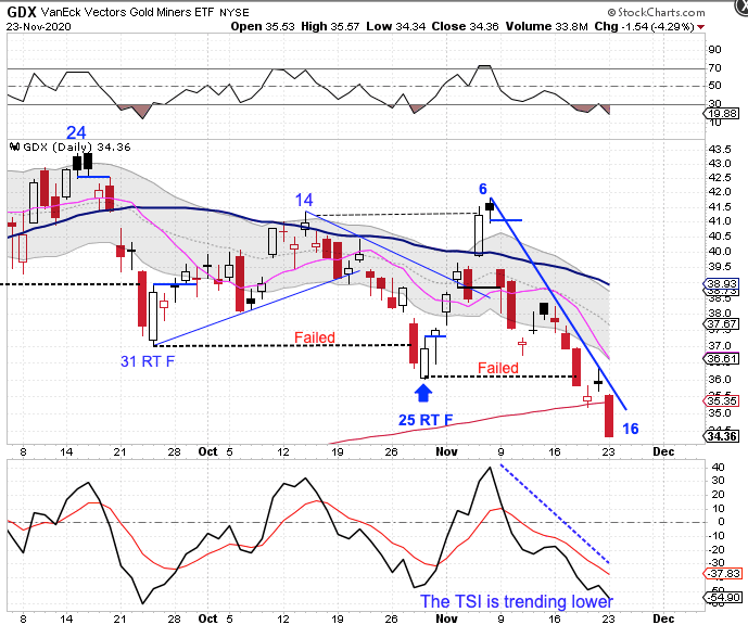 The Miners delivered bearish follow through on Monday by breaking convincingly below the 200 day MA to close 4.29% lower for the day.