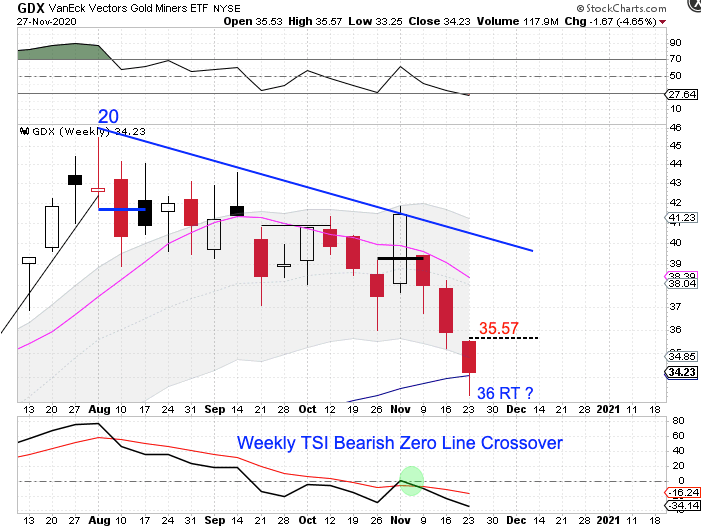 On the weekly chart — the Miners formed a bullish weekly reversal this week at support from the 50 week MA. Only once in the past 5 years did the intermediate Miner cycle stretch past 32 weeks — and that one ran 33 weeks. So at 36 weeks, once a weekly swing low forms it should signal the new intermediate cycle. A break above 35.57 will form a weekly swing low. The Miners did close below the lower weekly cycle band to end its weekly uptrend and begin its weekly downtrend. Closing below the lower weekly cycle band indicates that the Miners are seeking out their yearly cycle low.