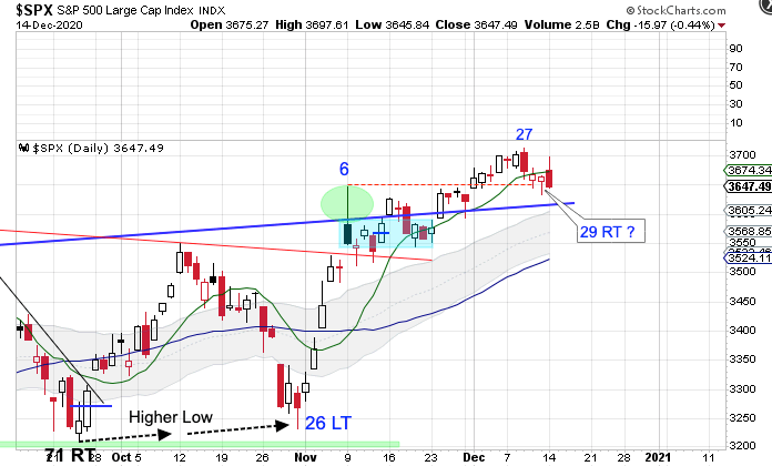 However stocks did not close above the 10 day MA. At 30 days, a close below the blue trend line will signal that a daily cycle decline is in progress. But, a bullish reversal off of the blue trend line will still keep a bubble scenario on the table. Stocks are in a daily uptrend and will remain so unless they close below the lower daily cycle band.