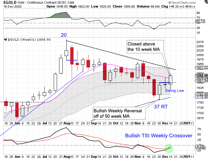 Gold formed a bullish weekly reversal off support from the rising 50 week MA on week 37.