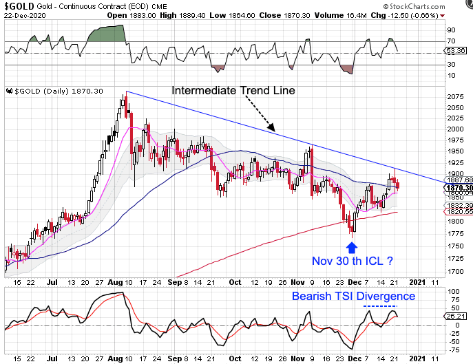 Gold needs to break above the declining intermediate trend line in order to confirm that November 30 th was the ICL. And since gold is in a daily uptrend, if gold can form a swing low above the lower daily cycle band then gold would remain in its daily uptrend and trigger a cycle band buy signal.