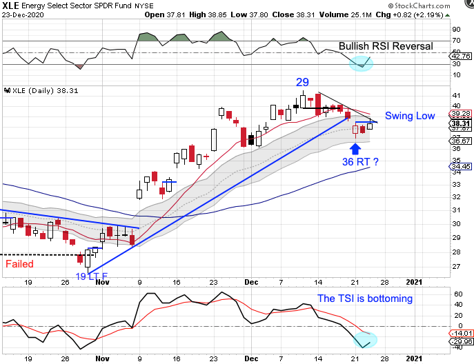 XLE printed its lowest point on Monday, day 36. That places it deep in its timing band for a daily cycle low. XLE formed a swing low on Wednesday. A close above the 10 day MA will confirm the new daily cycle. Since XLE has been in a daily uptrend, Wednesday’s swing low indicates that XLE will remain in its daily uptrend and trigger a cycle band buy signal.