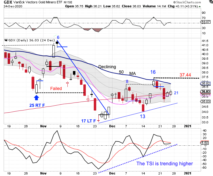 The Miners were rejected by the 50 day MA. They formed a swing high then closed below both the 200 day MA and the 10 day MA on Tuesday to signal the daily cycle decline. At this point if the Miners were going to extend their intermediate cycle decline, then the gravitational pull of the pending ICL should have taken over. Instead, the Miners regained both the 10 day MA and the 200 day MA on Wednesday and closed higher again on Thursday. A break above the day 16 high of 37.44 will shift the odds towards a right translated daily cycle formation. Which is one of the confirmations that the Miners have begun a new intermediate cycle. The Miners are in a daily uptrend. A close back above the upper daily cycle band will affirm the daily uptrend and trigger a cycle band buy signal.