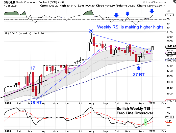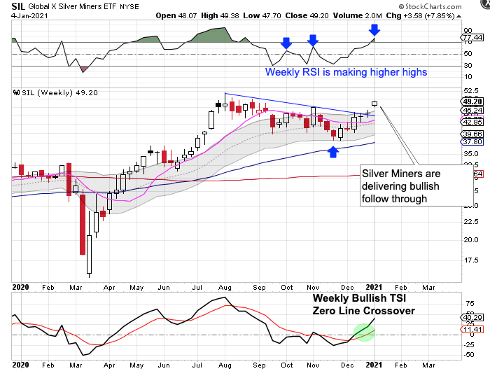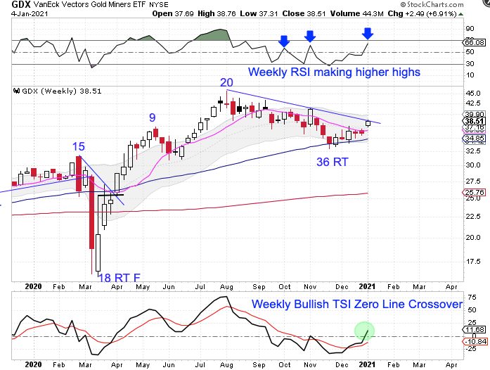 The Silver Miners ended last week breaching the declining weekly trend line. This week they have delivered bullish follow through and started off really strong, up 7.85% on Monday. This is only week5 for the new intermediate cycle. Precious metals should rally for the next 2 – 3 months before topping.