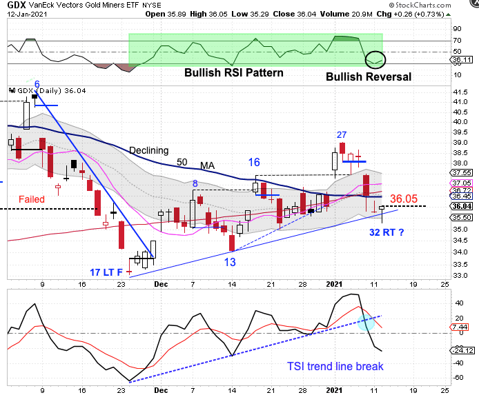 Tuesday’s bullish reversal sets the Miners up for printing a daily cycle low. While the 10 day MA has not turned appreciably lower, the Miners closed below the 10 day MA, 200 day MA and the 50 day MA and breached the daily cycle trend line. And at 32 days, that places the Miners in their timing band for a daily cycle low. A swing low and close back above the 50 day MA will signal a new daily cycle. The Miners have been in a daily uptrend. If a swing low forms above the lower daily cycle band then the Miners will remain in their daily uptrend and trigger a cycle band buy signal.