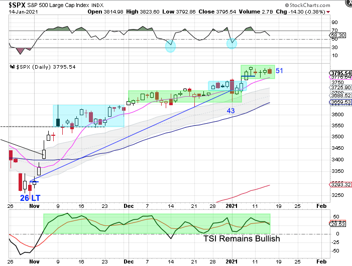 Stocks have been stair-stepping higher, consolidating in order to allow the 10 day MA to catch up to price, and then star-stepping higher some more. Thursday was day 51 placing stocks deep in their timing band for a daily cycle low. At this point we would need to see a close below the 10 day MA and some bearish follow through to signal the daily cycle decline.
