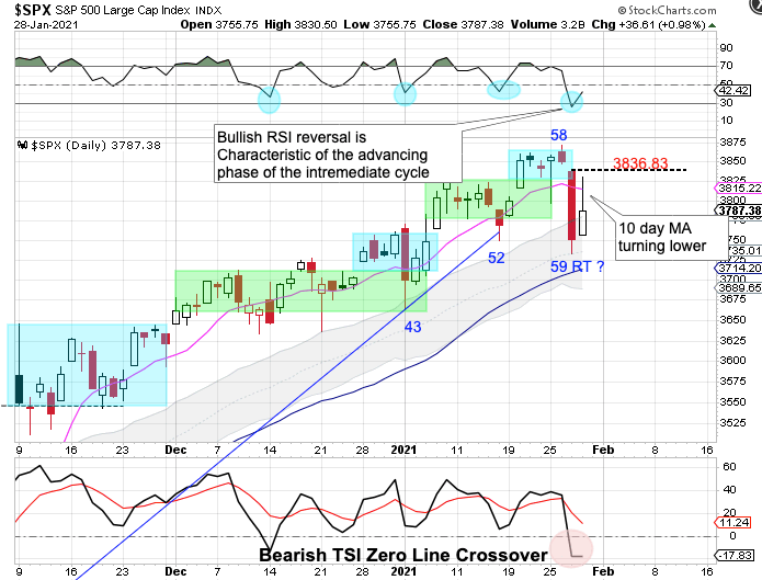 Stocks have not delivered anything that we could recognize as a daily cycle decline –until Wednesday. Wednesday’s drop caused the RSI Index to become oversold. On Thursday, the RSI index formed a bullish reversal. The bullish RSI reversal is characteristic of stocks being in the advancing phase of its intermediate cycle.